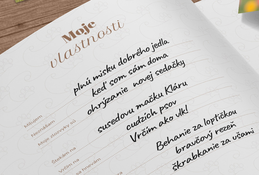 Vyplňte pripravené riadky na uchovanie vlastností a príbehov vášho psíka.